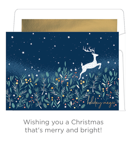 Capture the wonder of the season with Holiday Magic Reindeer, a luminous design from the Luxury Favorites collection. A white reindeer leaps through a starry navy sky above a forest of stylized foliage and berries, with shimmering gold script that reads “holiday magic.” Paired with a coordinating gold foil-lined envelope, this oversized card delivers elegance and enchantment in every detail.