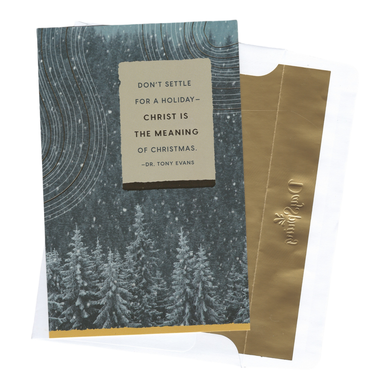 Celebrate the true essence of Christmas with the Tony Evans "Christ is the Meaning" card set from DaySpring. This elegant collection features a serene winter scene, with snow-covered pine trees and gentle snowflakes creating a tranquil backdrop. The inspirational message from Dr. Tony Evans—“Don’t settle for a holiday—Christ is the meaning of Christmas”—is prominently displayed, serving as a gentle reminder of the profound significance of the season.