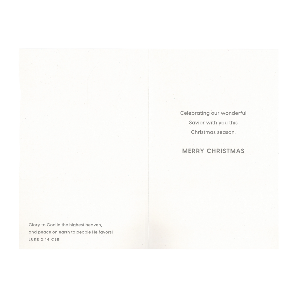 Inside, the card continues to uplift with a heartfelt message focusing on the birth of Christ as the cornerstone of Christmas joy. These 18 beautifully designed cards are perfect for those wishing to share a thoughtful and spiritually rich greeting with friends and family. Spread the true message of love, peace, and the wondrous gift of Jesus with this exquisite card set, ensuring your Christmas wishes resonate with meaning and grace.