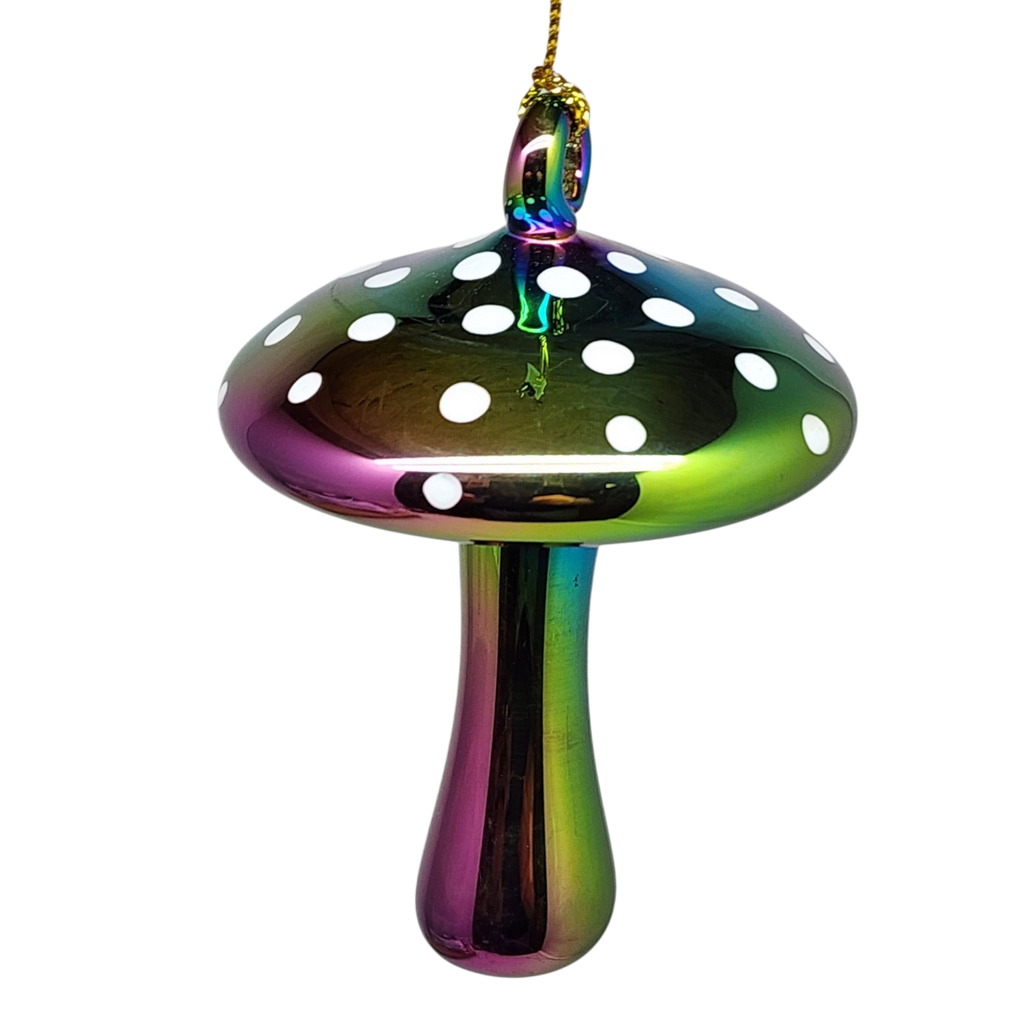 Step into a whimsical wonderland with this charming chromatic mushroom glass ornament. Handcrafted in Egypt from mouthblown German Pyrex glass, it shines in a captivating spectrum of iridescent colors that shift and shimmer as it catches the light. Standing about 3.5 inches tall, this playful mushroom is dotted with bright white spots for a classic fairy-tale look, making it a delightful and unexpected touch for your holiday décor.