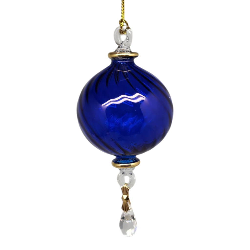 Elevate your holiday decor with our stunning mouth-blown glass ornament, crafted in the enchanting land of Egypt. This exquisite piece stands at just over 4 inches tall and embodies a rich tradition of artisanal glass-making. The vibrant deep blue hue is beautifully enhanced with elegant swirls and accented by genuine 24K gold—a touch of opulence that turns any ordinary tree into a winter wonderland. Whether it hangs on a cozy Christmas tree or adorns your home throughout the year, this ornament is bound to catch any eye and spark conversation.