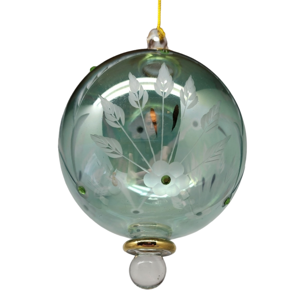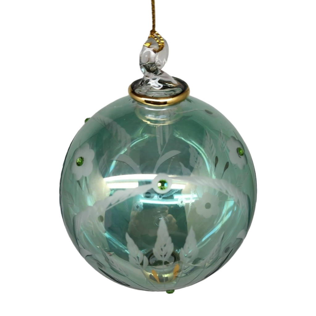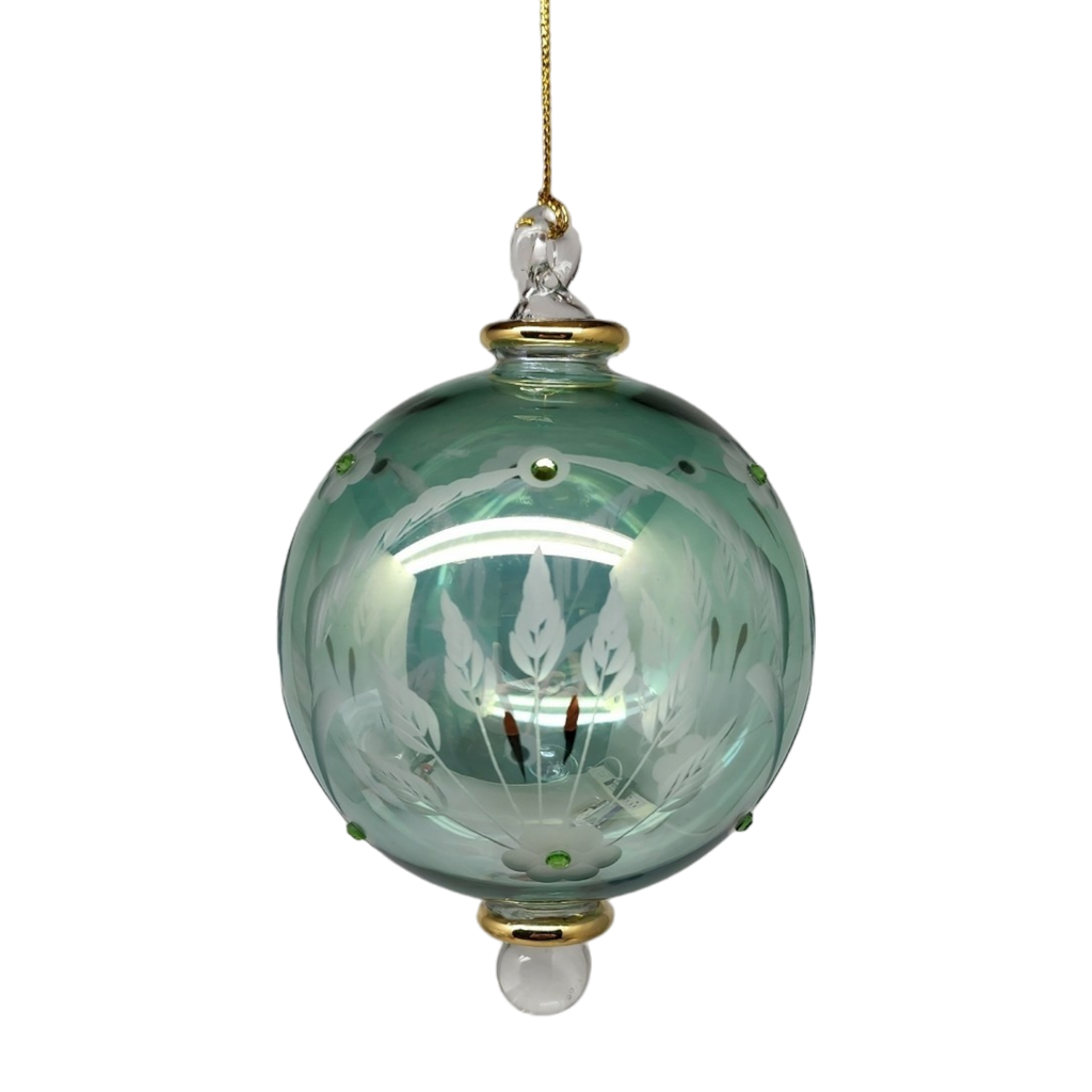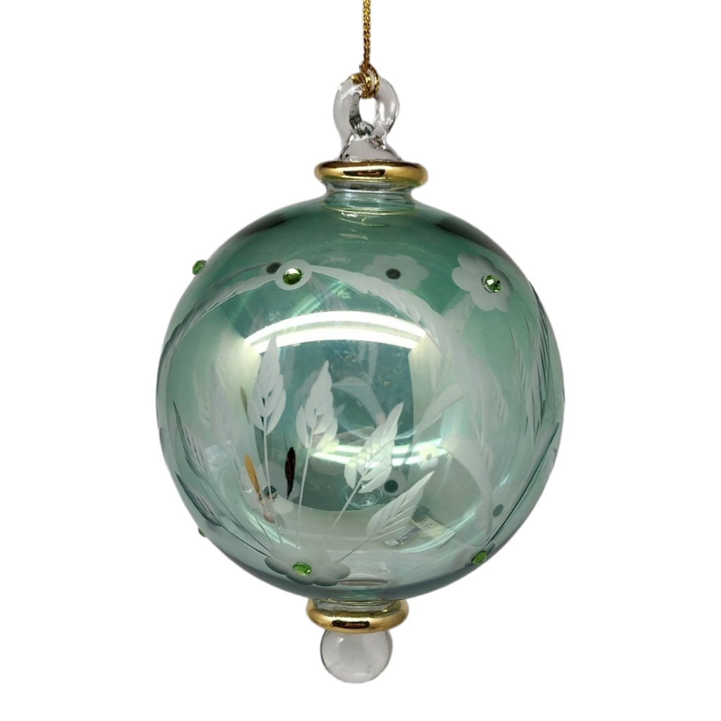 This captivating globe ornament is a celebration of botanical elegance for your holiday décor. Mouthblown from German Pyrex glass in Egypt, its translucent green finish is hand-painted and oven-baked to ensure lasting radiance. Delicate etched sprays of leaves and blossoms wrap around the globe like a frost-kissed meadow, while tiny crystal accents shimmer like morning dew. Lavish 24K gold rings crown the top and base, framing the design with a touch of opulent warmth.