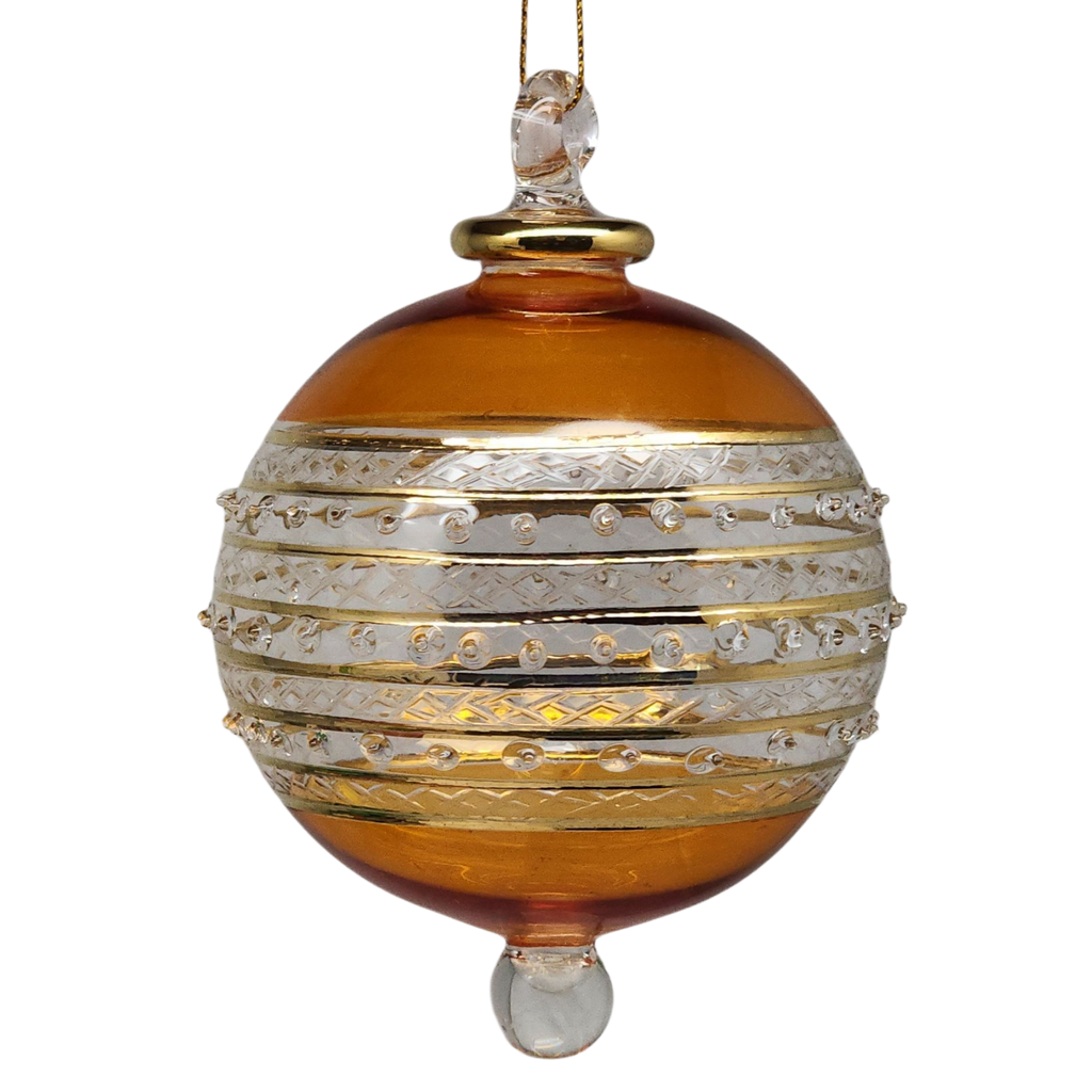 Elevate the elegance of your festive decor with the mesmerizing Ring Etched Stipple Ball in Gold. This captivating ornament personifies artistic brilliance, handcrafted meticulously from Pyrex and adorned with intricate ring etchings. The striking copper hue, enhanced by 10k genuine gold plating, exudes a regal charm. Measuring just over 4 inches in length and almost 2.5 inches in diameter, this ornament promises to be an alluring centerpiece on your holiday tree.