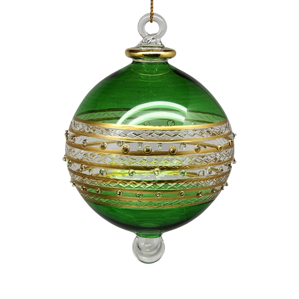 Elevate the elegance of your festive decor with the mesmerizing Ring Etched Stipple Ball in Green. This captivating ornament personifies artistic brilliance, handcrafted meticulously from Pyrex and adorned with intricate ring etchings. The striking green hue, enhanced by 10k genuine gold plating, exudes a regal charm. Measuring just over 4 inches in length and almost 2.5 inches in diameter, this ornament promises to be an alluring centerpiece on your holiday tree.