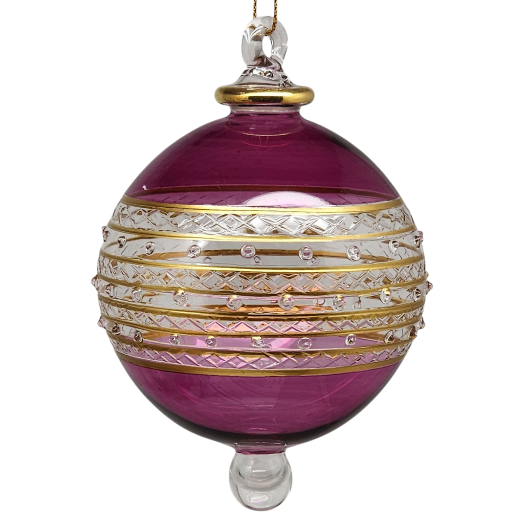 Infuse your holiday decor with the enchanting color of the Ring Etched Stipple Ball Ornament in purple. This exquisite piece, standing just over 4.5 inches tall, is a handcrafted gem made from German Pyrex glass, showcasing the exceptional skill of Egyptian artisans. Its whimsical design features elegant etched rings and delicate golden accents, which beautifully contrast the rich purple glass, creating a striking ornament perfect for any festive display.