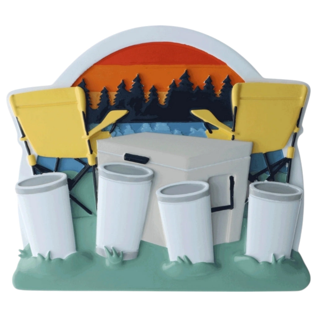 Celebrate your love for family adventures and the great outdoors with our Metal Cup Family of 4 Ornament! This vibrant piece captures the essence of camping joy, featuring two cozy yellow chairs flanking a cooler and four metal cups, all set against a backdrop of stunning sunset hues. This ornament beautifully represents the warmth of gathering with loved ones around the campfire, sharing stories, laughter, and memorable moments under the stars. It's the perfect way to commemorate those cherished family outings and create lasting memories.