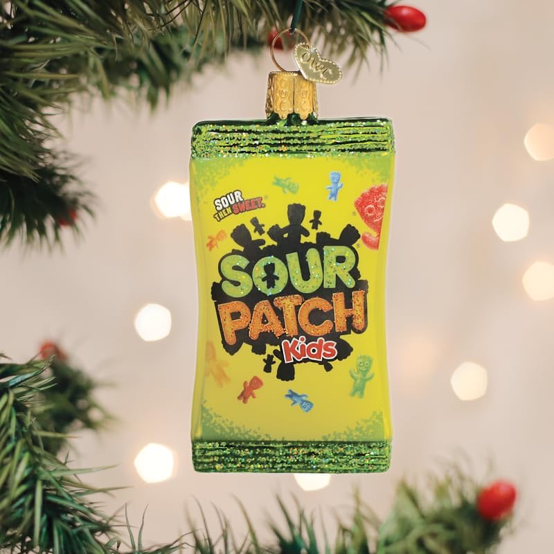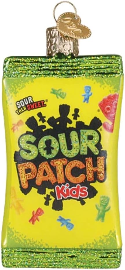 Add a tangy twist to your tree with this Sour Patch Kids Bag Glass Ornament! Styled to resemble the iconic candy packaging, it features a bright yellow background, playful logo, and colorful gummy figures in red, blue, green, and orange. Green glitter edges and a gold hanging loop give it a festive sparkle, making it a standout piece for candy lovers and collectors of quirky holiday décor.