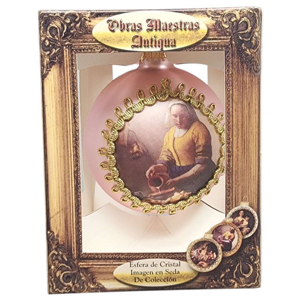 Celebrate quiet beauty with this collectible ornament featuring a silk reproduction of The Milkmaid by Johannes Vermeer. Rendered on a soft pink glass ball and framed with gold trim, this iconic Dutch masterpiece captures a moment of everyday grace. The reverse side sparkles with “2025” in glitter, making it a refined keepsake for art lovers and holiday collectors alike.