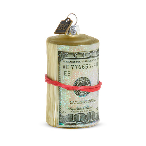 The 2.75" Thanks a Million Ornament is a playful and eye-catching piece for your holiday decor. Made of glass, this ornament features a realistic stack of $100 bills, complete with a red band, symbolizing prosperity and gratitude. Measuring 1.75" D x 2.75" H, it adds a touch of whimsy and elegance to your festive arrangements.