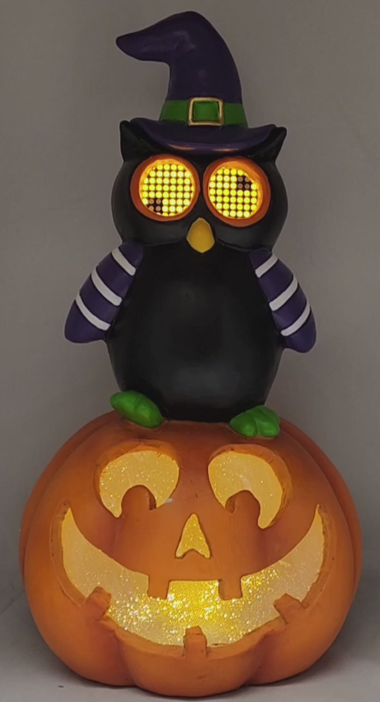The owl's eyes light up and dance in a captivating digital pattern, creating a mesmerizing visual effect that enchants both kids and adults alike. This engaging décor piece requires 3 AA batteries (not included), making it easy to place anywhere in your home—from the porch to the mantel or as part of your spooky centerpiece. Add a touch of charm and fun to your holiday festivities with the Animated Halloween Owl on Pumpkin, a perfect piece to create a whimsical and inviting atmosphere during your celebrations!