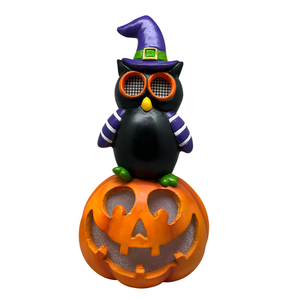 Celebrate the Halloween season with our delightful Animated Halloween Owl on Pumpkin! Standing at an impressive 14 inches tall and measuring 8 inches wide by 5 inches deep, this whimsical decoration features an adorable black owl dressed in a festive witch's hat. Perched atop a cheerful jack-o'-lantern, this charming figure brings a playful spirit to your Halloween displays.