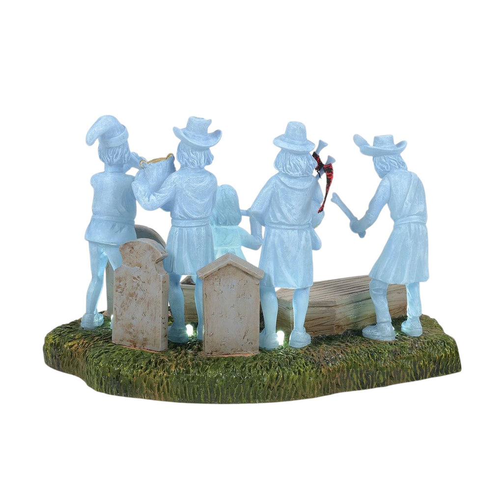 Bring a spine-chilling musical atmosphere to your Halloween Village with "The Phantom Five," a captivating accessory standing at 3.75 inches tall! This eerie yet charming quintet consists of ghostly figures, each holding an instrument as they serenade the dearly departed in classic spectral style. With their ethereal glow, these musicians evoke a sense of playful spookiness, perfect for setting the mood for your haunted celebrations.