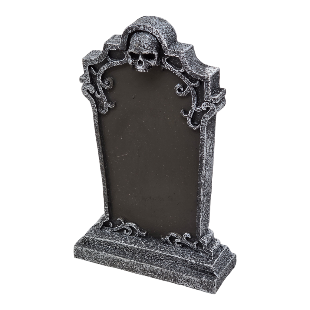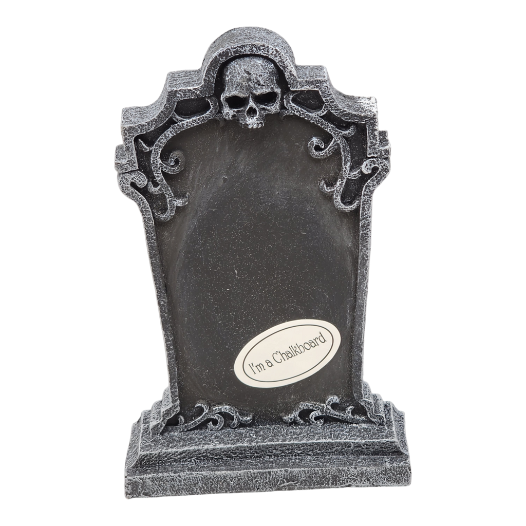Elevate your Halloween decor with this spine-tingling chalkboard tombstone! Standing at 8 inches tall and 5 inches wide this creatively designed piece features a spooky skull atop an ornate engraved frame perfect for setting a creepy yet fun vibe at your festivities. The textured resin surface gives it an authentic graveyard feel making it a standout addition to your haunted house setup or outdoor display.