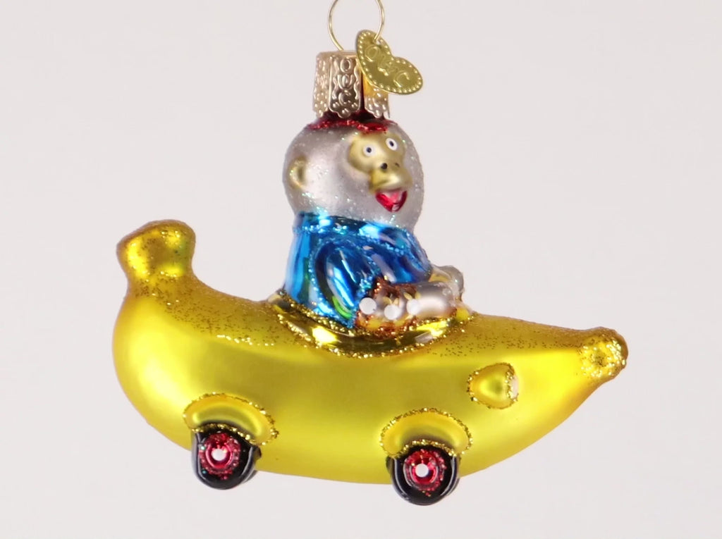 Add a burst of playful energy to your tree with Bananas Gorilla's Bananamobile, a whimsical creation from the Old World Glass collection by Old World Christmas. This cheerful ornament features a monkey in a glittery banana-shaped car, decked out in a vibrant outfit and ready to deliver holiday smiles. Mouth-blown, silvered, and hand-painted with meticulous detail, it’s a joyful nod to vintage toys and festive imagination.