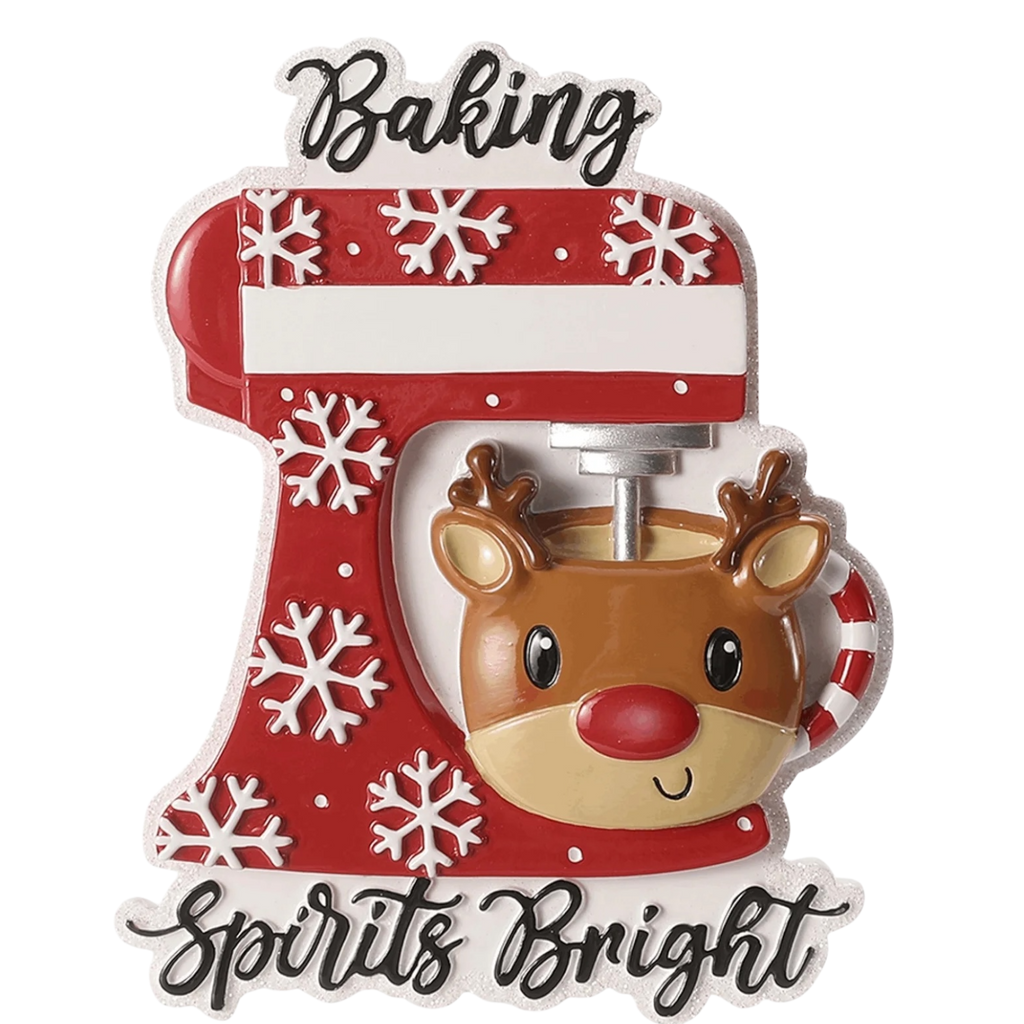 Get ready to whip up some holiday magic with our Baking Spirits Bright Ornament! This adorable piece combines the joy of festive baking with playful charm, featuring a cheery red mixing stand adorned with whimsical snowflakes. At the heart of this decoration is a precious reindeer face, complete with bright eyes and a joyful smile, all exuding warmth and cheer for the holiday season. As you hang this whimsical ornament on your tree, let it remind you of the delightful moments spent baking holiday treats, sharing laughter, and creating sweet memories with loved ones.