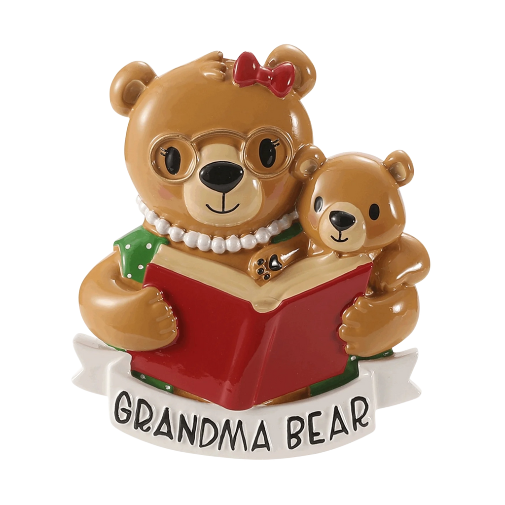 Celebrate the love of family with the delightful Grandma Bear Ornament! This charming ornament features an endearing Grandma Bear clad in a lovely dress, complete with a pearl necklace and reading a book to her adorable little bear. Perfectly capturing the warmth and joy of storytelling and bonding, this ornament measures about 3 and a half inches tall and 3 and a quarter inches wide—an ideal size to hang on your Christmas tree or display on a shelf to honor cherished memories throughout the holiday season.