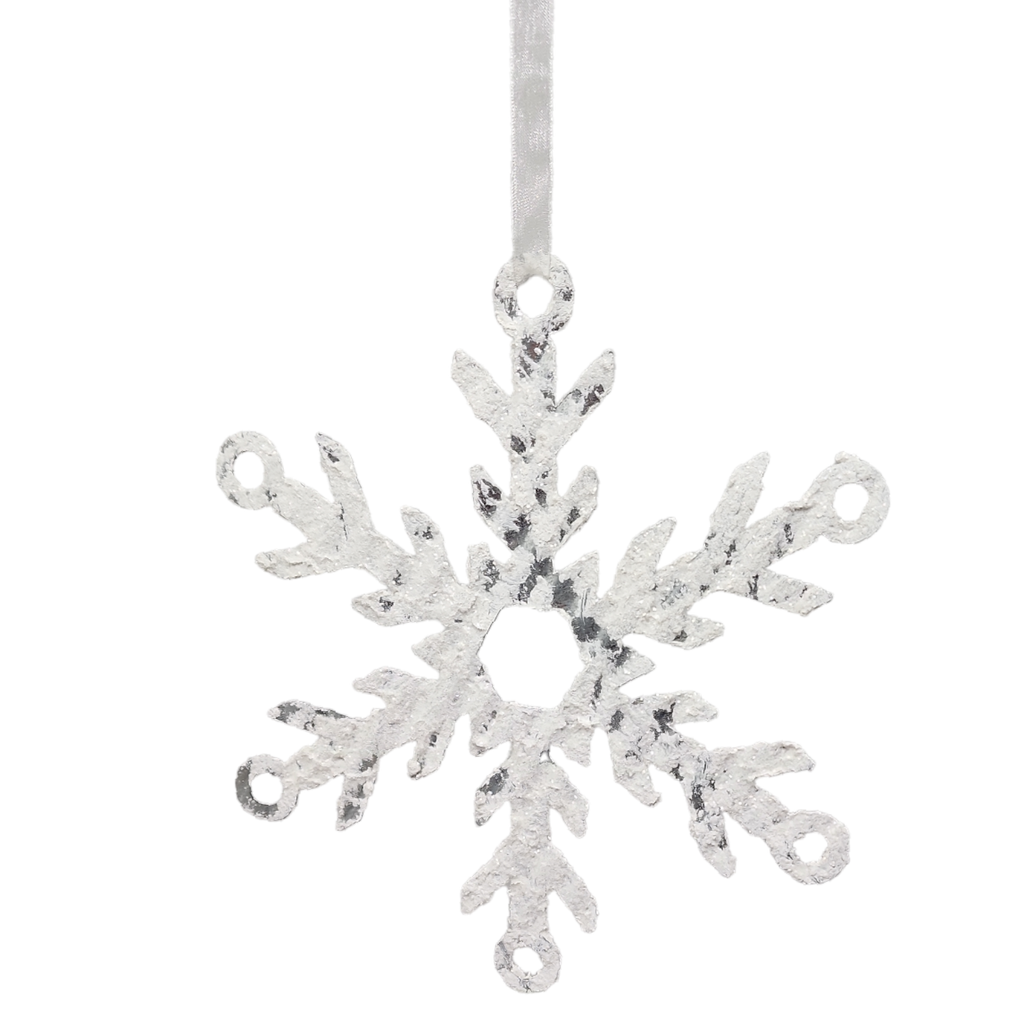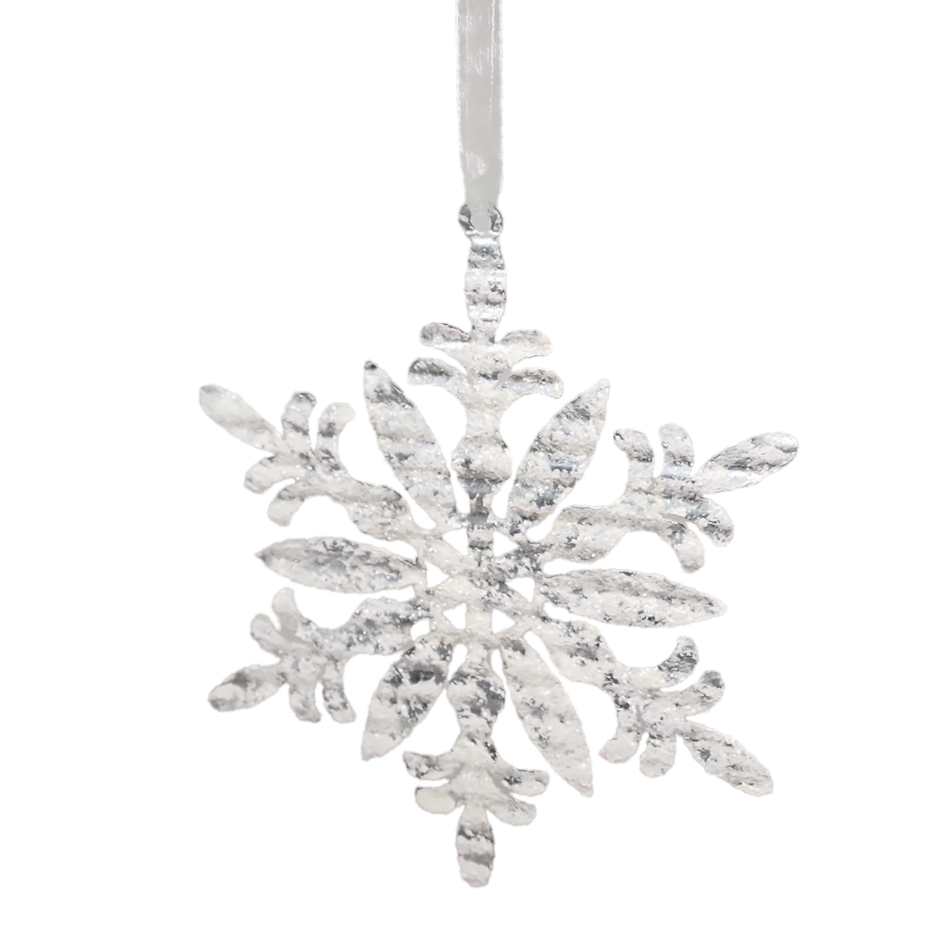 Diecut galvanized metal Snowflakes coated on both sides with a white 'snow' flocking.