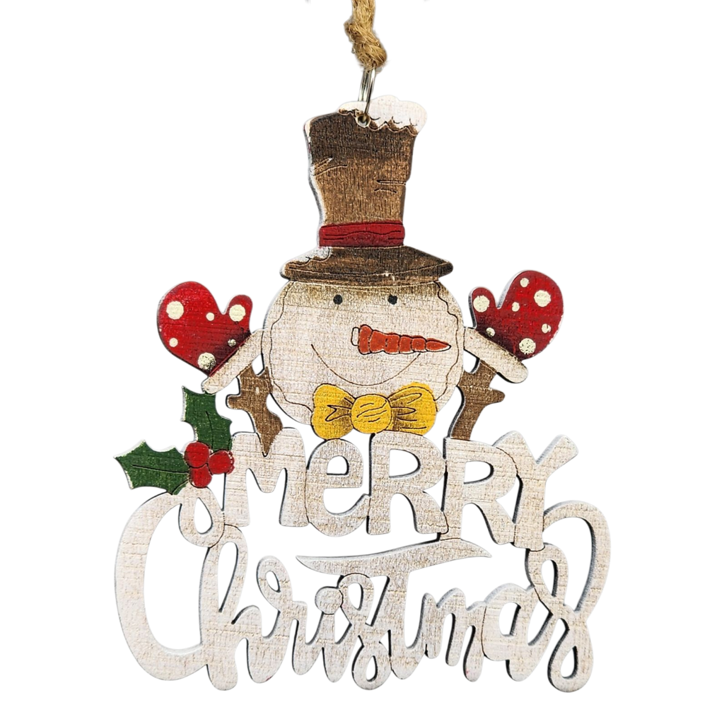 Bring a touch of winter wonder to your holiday decor with our delightful Merry Snowman Christmas Ornament! Measuring approximately 4 inches by 3.25 inches, this charming ornament features a beautifully laser-cut design of a cheerful snowman wearing a festive top hat, complete with adorable red mittens and a bright yellow bow. The playful "Merry Christmas" lettering adds a whimsical flair, making it a perfect addition to your holiday tree or a delightful gift for friends and family.