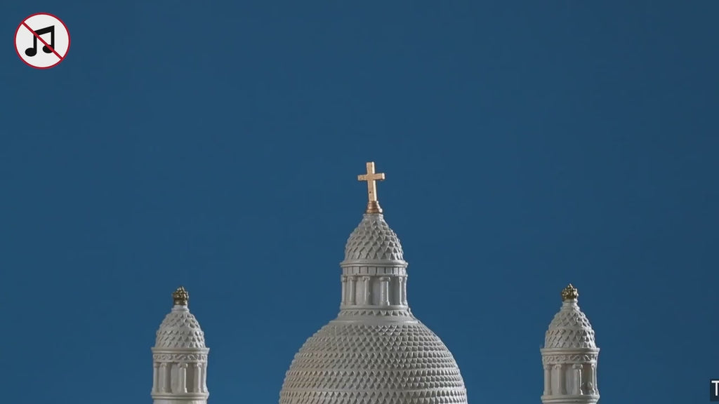 This image features an intricately designed miniature cathedral, reminiscent of grand historic basilicas. The structure is adorned with multiple domes and spires, each topped with ornate finials, and the central dome is crowned with a cross. The cathedral's facade is rich in detail, featuring statues, decorative elements, and beautifully arched windows inset with colorful stained glass.