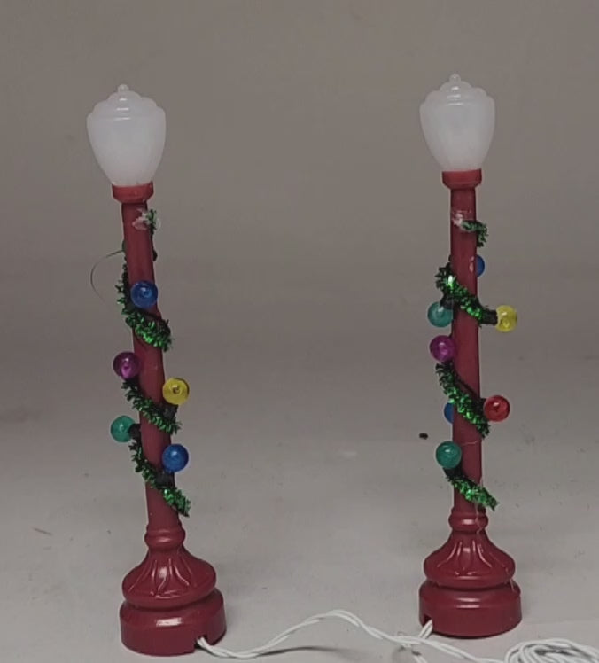 Illuminate your Christmas village with the warm, festive glow of these charming Battery-Operated Lamp Posts. This delightful set includes two beautifully crafted lamp posts, each adorned with colorful Christmas ornaments and lush green garland, evoking the joyful spirit of the holiday season. The deep red base of the lamp posts adds a vibrant pop of color, making them a standout feature in any village scene.