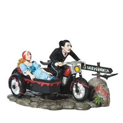 Vampire riding motorcycle with lady in sidecar at road sign pointing to Transylvania village accessory