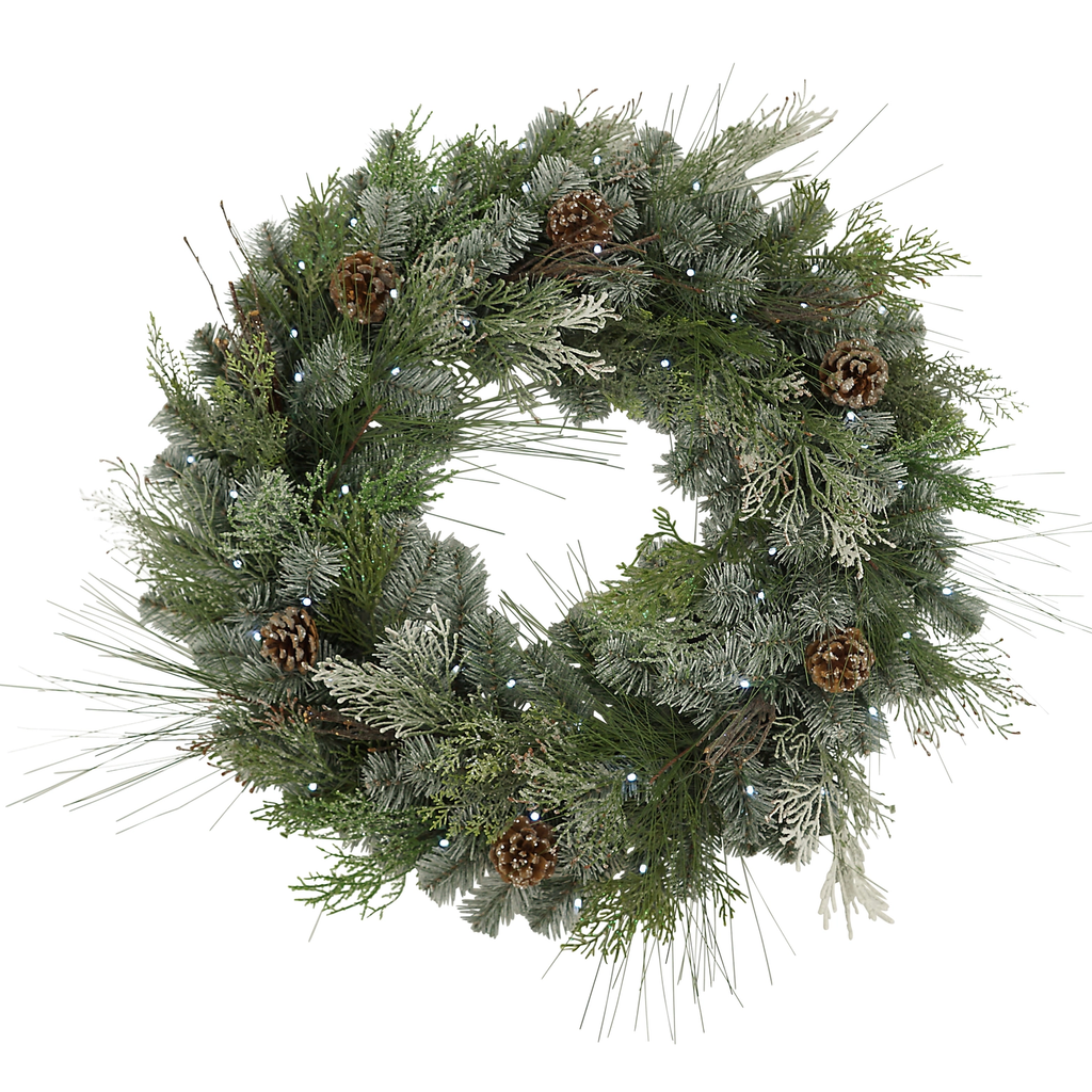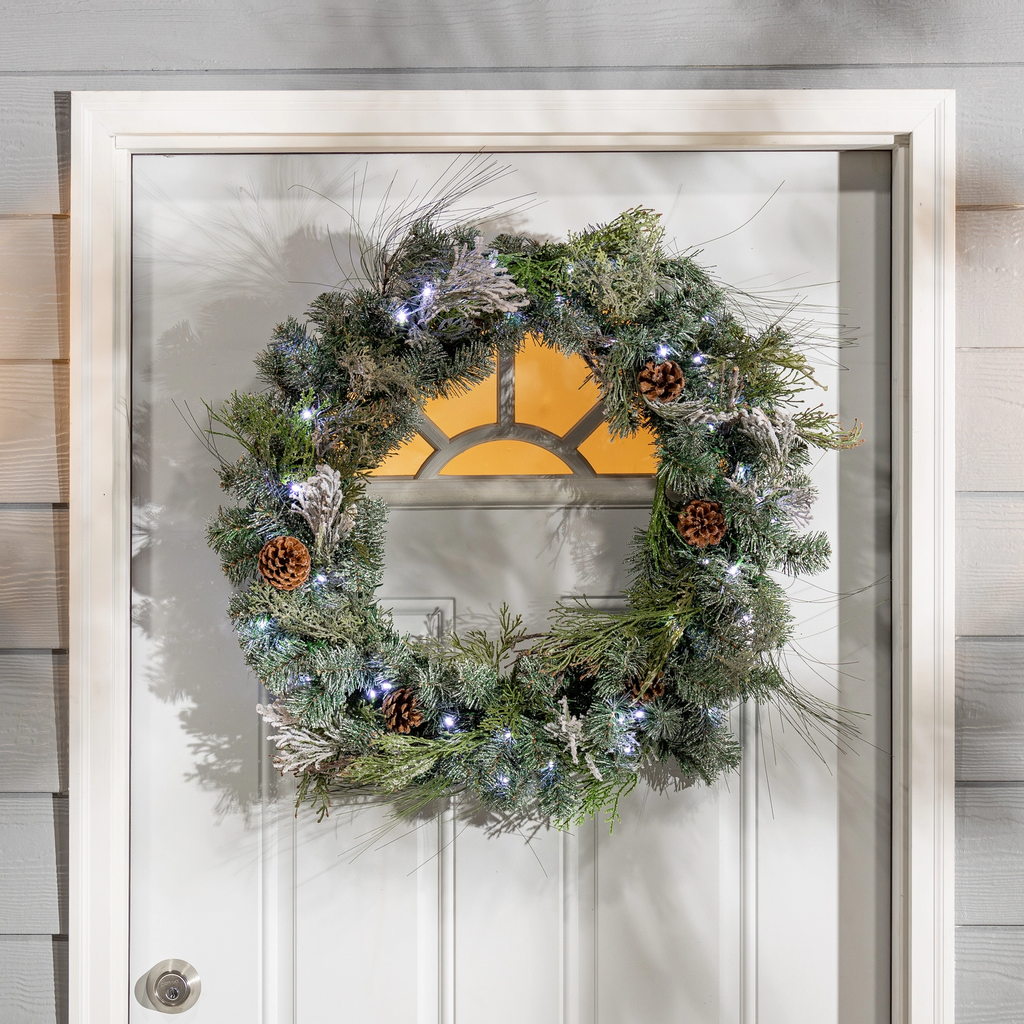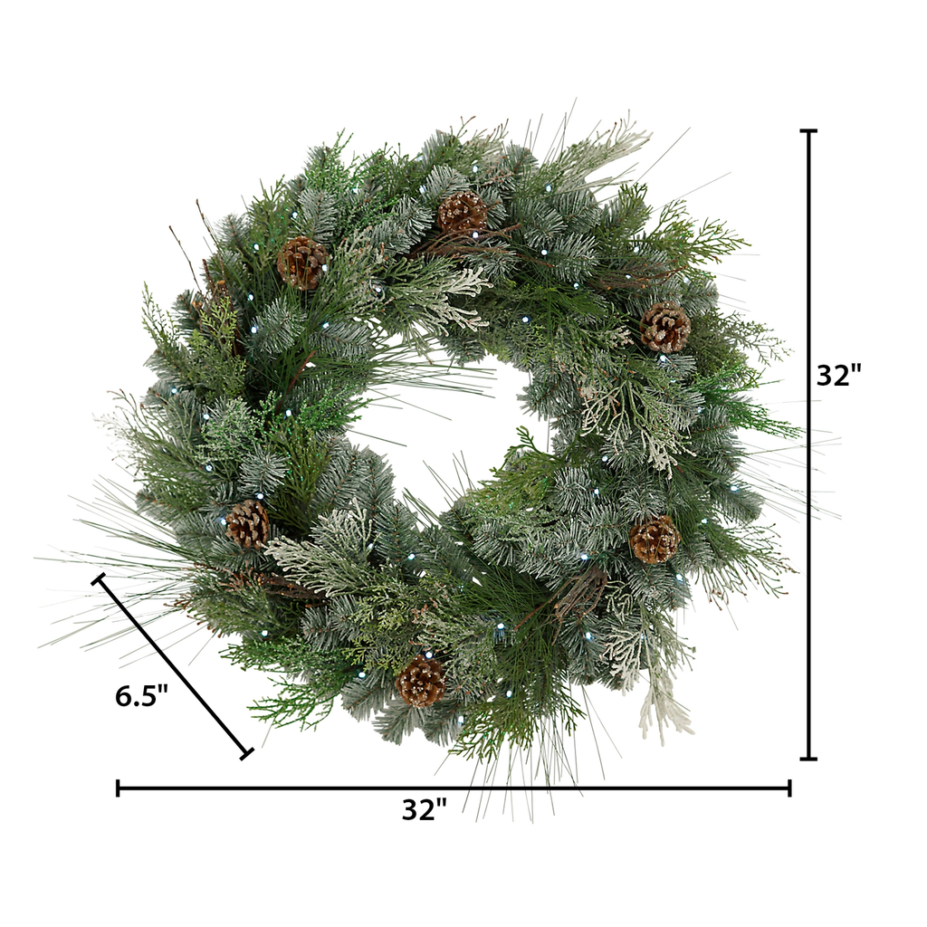 This 32-Inch Pre-Lit Snowy Mixed Pine Wreath by Gerson International is a lush, multi-textured statement piece designed to bring a "hearth-and-home" feel to your winter decor. Combining frosted evergreens with natural elements, it offers a sophisticated, woodland look that transitions perfectly from Christmas through the entire winter season.