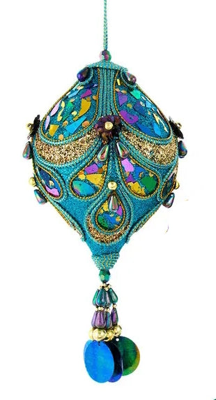 This stunning onion-shaped ornament brings a touch of elegance and magic to your holiday decor. Inspired by the mesmerizing splendor of peacock feathers, it features a rich combination of purple, green, blue, and gold hues that shimmer and shine. Decorated with sequins, glitter, and beads, this ornament captures the essence of regal beauty. Its unique onion shape adds an intriguing dimension to your Christmas tree, making it a delightful focal point during the festive season.