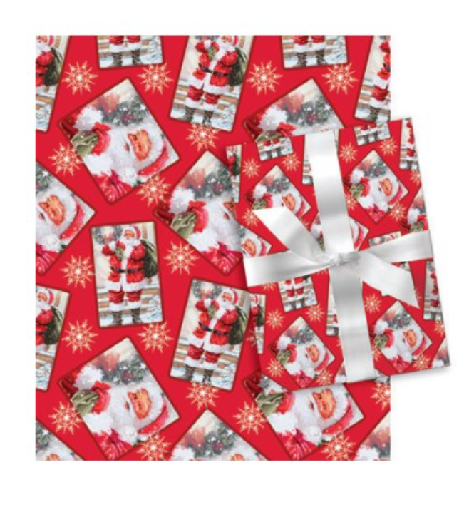 A timeless tribute to Christmas nostalgia, this Classic Santa children’s wrap features jolly St. Nick in two charming poses—one carrying his sack through the snow, the other offering a warm, close-up smile. Set against a festive red backdrop with scattered snowflakes, it brings that traditional holiday magic kids recognize instantly and adults love for its vintage warmth.