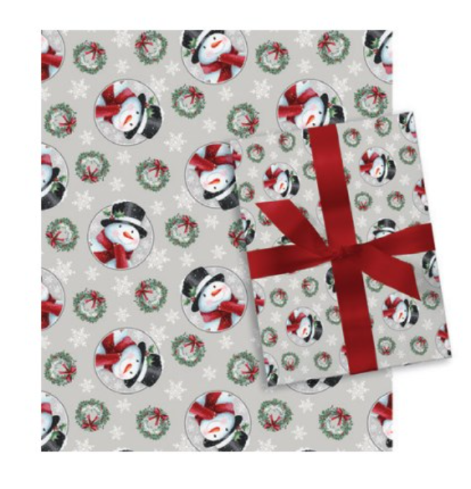 A cheerful blend of winter icons, this Snowman & Wreath children’s wrap brings a friendly, festive spirit to every gift. Smiling snowmen in top hats, bright green wreaths with bows, and scattered snowflakes create a playful pattern that feels right at home under the tree. The soft gray background keeps the design light and welcoming, perfect for kids’ presents and family celebrations.