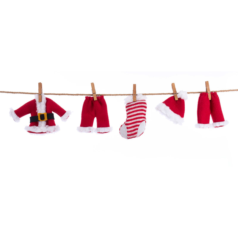 Kurt Adler's Santa Suit novelty garland is a fun and festive addition to your holiday décor or Christmas tree. This garland features Santa's suit hung-up with clothes pins on a twine garland.