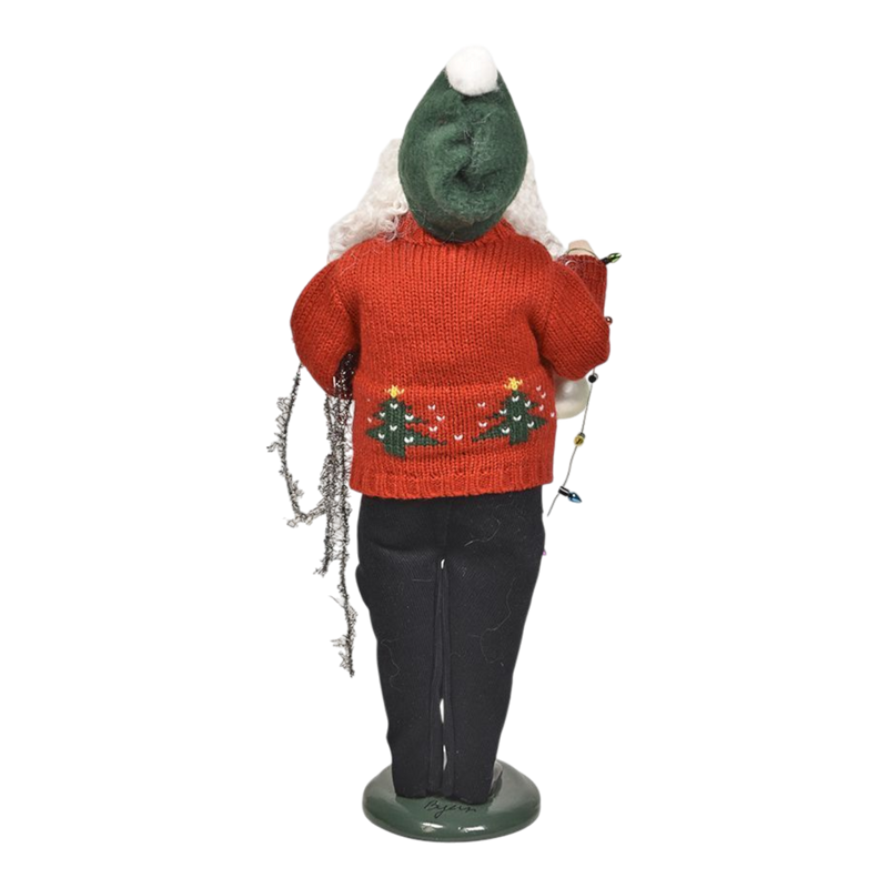 Invite the magic of the holiday season into your home with the delightful Decorating Santa figurine! Standing at a festive 13 inches tall, this enchanting Byers' Choice collectible captures the essence of Christmas cheer. Dressed in a cozy red sweater adorned with festive trees, Santa is ready to spread holiday joy as he holds a lantern in one hand and colorful strands of lights in the other. His cheerful expression and fluffy white beard reflect the joy of decorating and the warmth of the season.