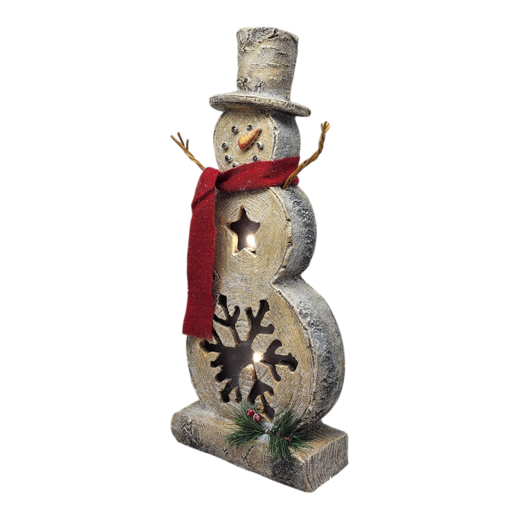 Brighten up your holiday decor with our charming 17.5-inch illuminated snowman figure a delightful centerpiece that exudes festive cheer. Crafted to resemble a rustic snowman with a whimsical hat and a vibrant red scarf this enchanting piece features cut-out snowflakes and star designs that glow with warm light creating a cozy ambiance in any room. Perfect for mantels tabletops or entryways it invites smiles and warmth throughout the holiday season.