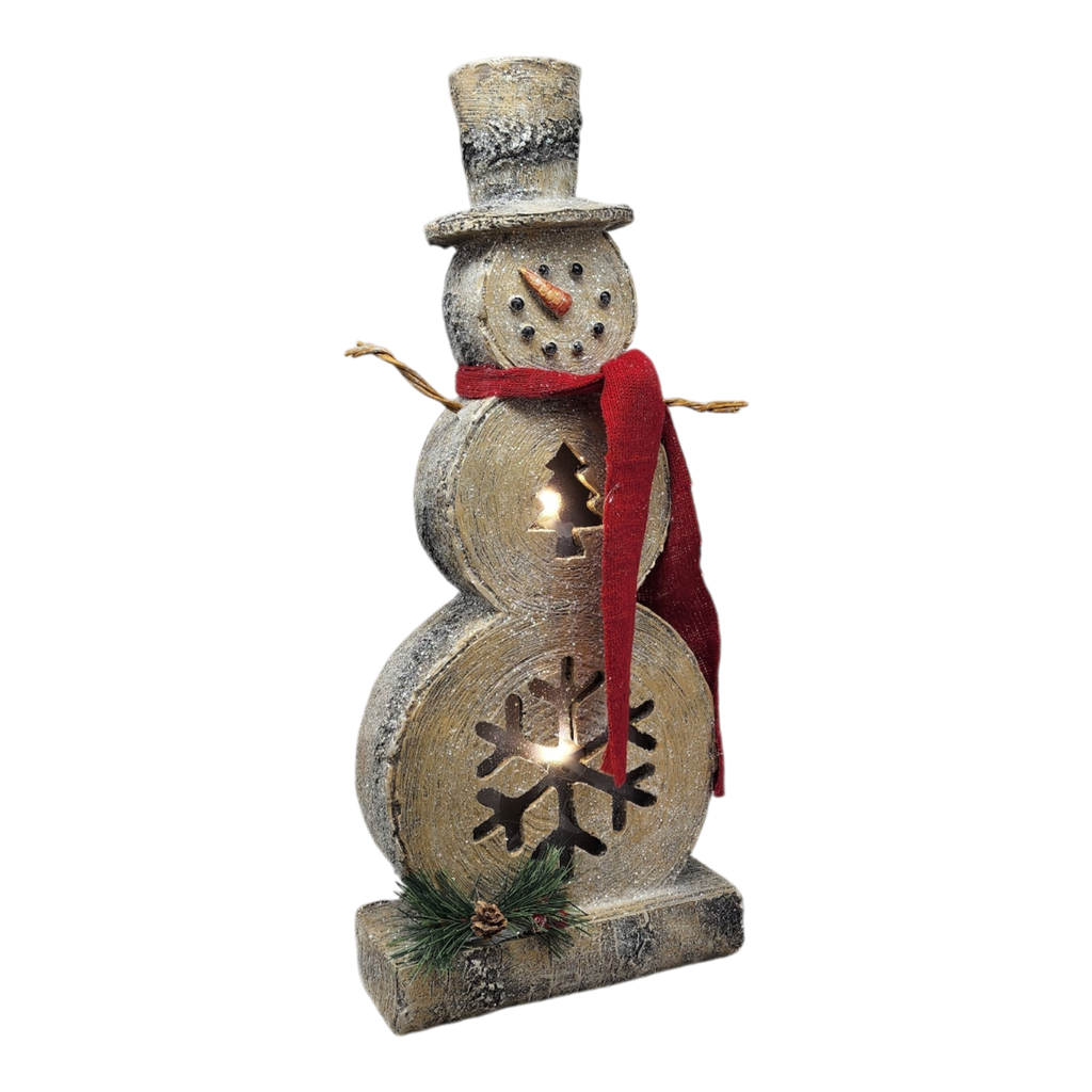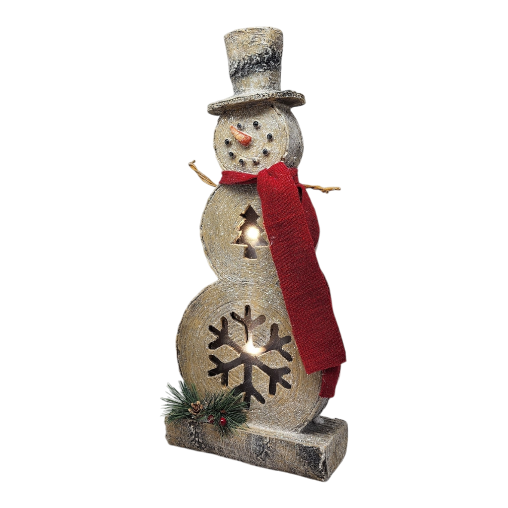 Brighten up your holiday decor with our charming 17.5-inch illuminated snowman figure a delightful centerpiece that exudes festive cheer. Crafted to resemble a rustic snowman with a whimsical hat and a vibrant red scarf this enchanting piece features cut-out snowflakes and star designs that glow with warm light creating a cozy ambiance in any room. Perfect for mantels tabletops or entryways it invites smiles and warmth throughout the holiday season.