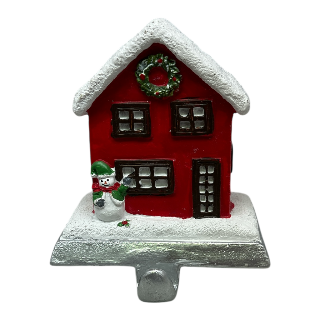 This cheerful stocking holder features a festive red house with a snow-covered roof and a friendly snowman standing proudly out front, broom in hand and dressed in a green hat and scarf. Made from sturdy resin, it’s designed to hold your holiday stocking while adding a playful, wintry touch to your mantel or shelf. The green wreath above the window and the snowy base complete the scene, making it feel like a moment straight out of a holiday village.