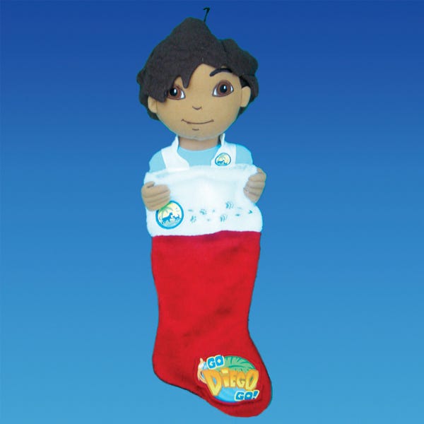This Diego Plush Head Stocking from Kurt Adler is a fun and festive way to add to the holiday décor of any little fan of Go Diego Go or Dora the Explorer! Diego is featured here in a plush head form, topping a red and white cuffed stocking. The stocking is adorned with the Go Diego Go logo