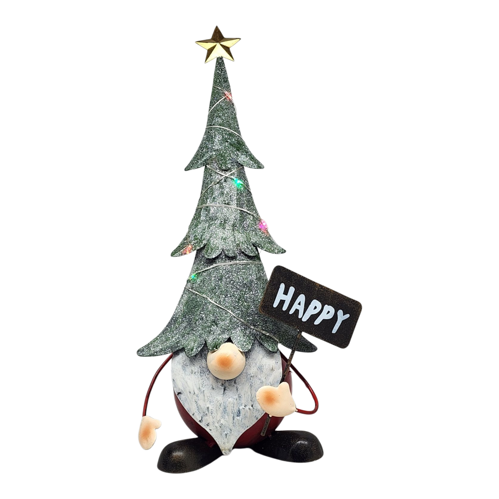 Infuse a whimsical spirit into your holiday decor with the delightful Lighted Metal Gnome Figurine! Standing at a charming 14 inches tall, this enchanting gnome features a festive tree-shaped hat and a friendly, bearded face that will surely bring smiles to all who see it. Available in two delightful designs, one holding a "Happy" sign and the other declaring "Welcome," each figurine adds a playful touch to your home during the holiday season.