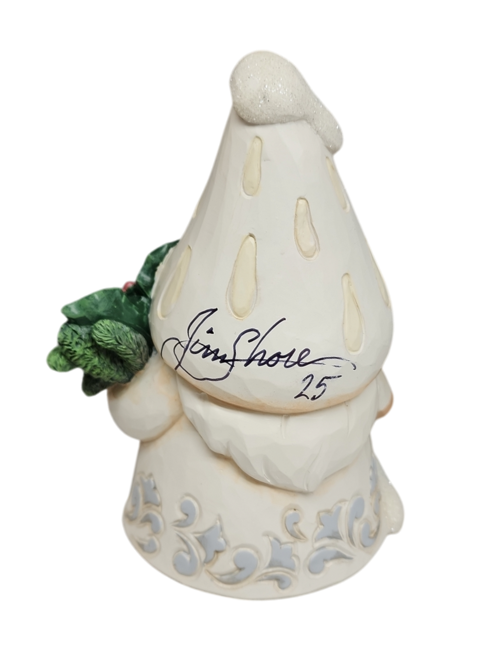 With his toadstool hat and festive bouquet of pine boughs and holly, this whimsical White Woodland Gnome captures the wintry fun of the holiday season. This uniquely-styled Forest Friend is handcrafted featuring Jim Shore's signature rosemaling designs.