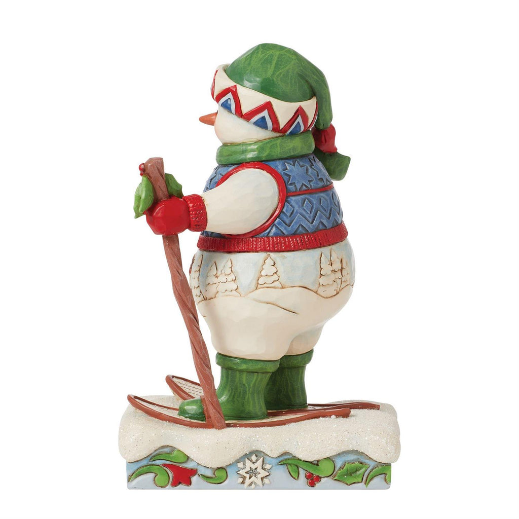 This festive snowman from Jim Shore enjoys an adventure in the snow. On a stage of snowflakes and red flowers, the snowman wears snowshoes with a mistletoe pole. Wearing blue, red, and green attire, the snowman shares a cottage scene with a reindeer.