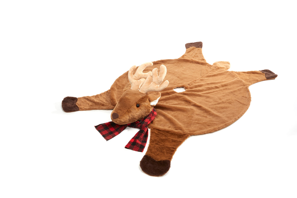 Add extra coziness to your Christmas décor this season with this plush reindeer tree skirt complete with a red and black plaid scarf. Spot clean only. Polyester.