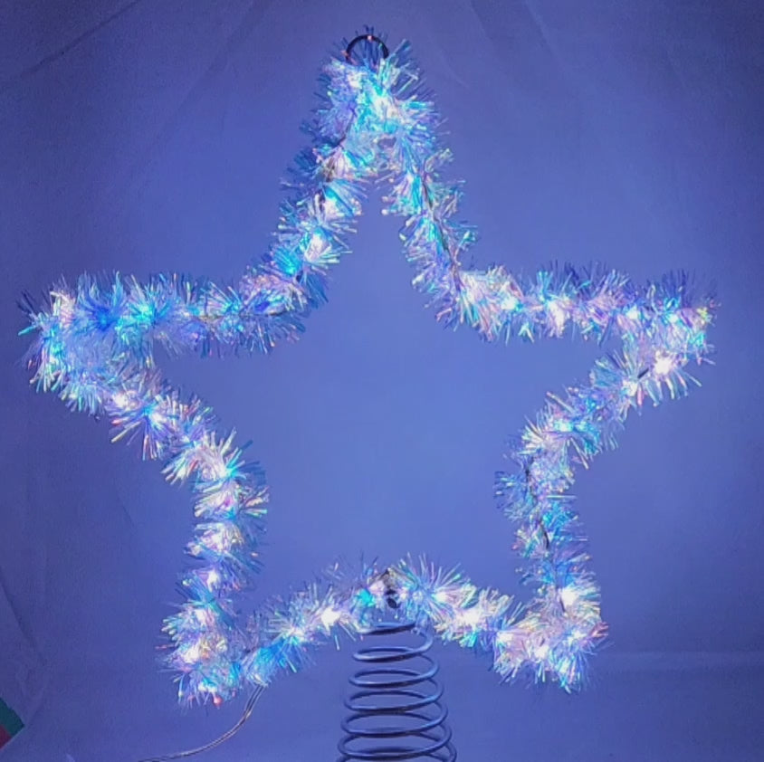 Add a beautiful twinkling touch to the lighting of your Christmas tree with Kurt Adler's cool white silver tinsel star treetop.