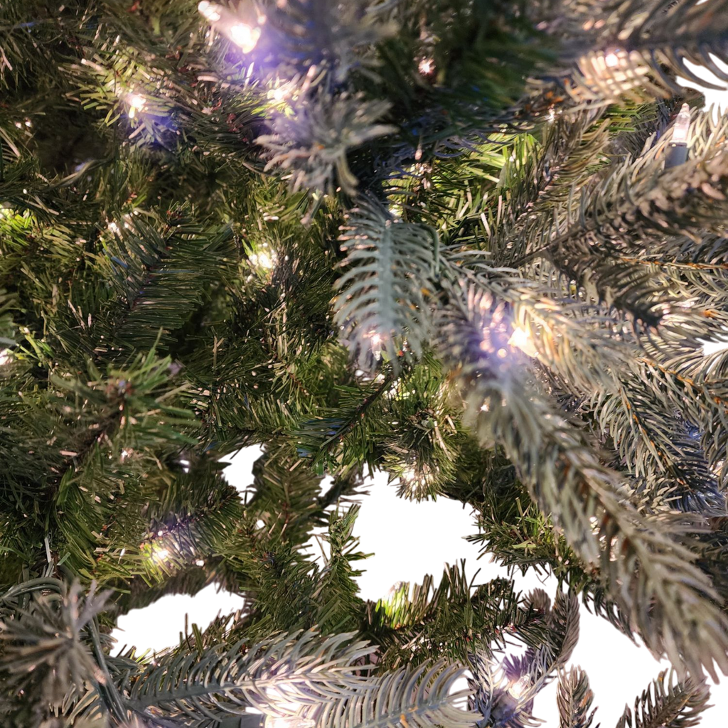 This style of tree is typically referred to as a "full" or "lush" Christmas tree. It features dense and voluminous branches that provide a traditional and classic look. The fuller style is commonly designed to mimic the appearance of real fir trees, such as the Fraser Fir or Douglas Fir, known for their thick foliage and symmetrical shape. This specific design is perfect for showcasing ornaments and lights, creating a stunning and festive display that often serves as the centerpiece for holiday celebrations. The realism of the artificial needles, combined with the incandescent bulbs, adds to the authentic look, making it a popular choice for holiday decorating!