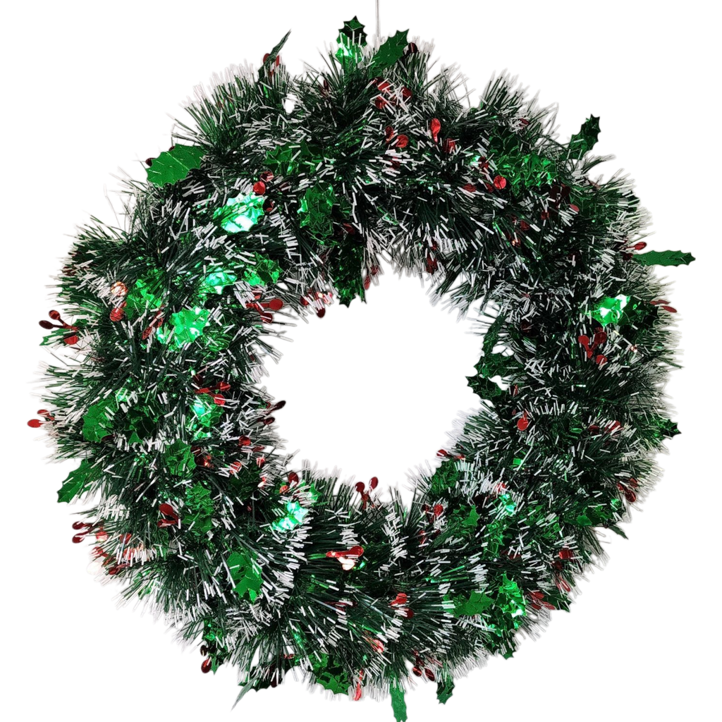 Welcome the festive season into your home with our stunning Frosted Holly Tinsel Wreath! Measuring 19 inches in diameter, this vibrant wreath is adorned with sparkling tinsel that beautifully reflects light, creating a dazzling display of holiday cheer. Complete with rich green leaves and clusters of red accents, this wreath perfectly captures the essence of winter, making it an ideal decoration for your front door, mantel, or any wall space that needs a touch of seasonal spirit.