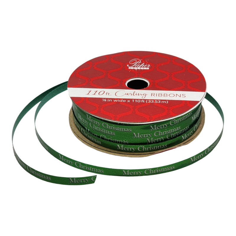 Wrap your gifts with classic holiday cheer using this green curling ribbon printed with crisp white “Merry Christmas” text. At 1/8 inch wide, it’s perfect for tying up treat bags, accenting bows, or curling around gift boxes to add a festive finishing touch.