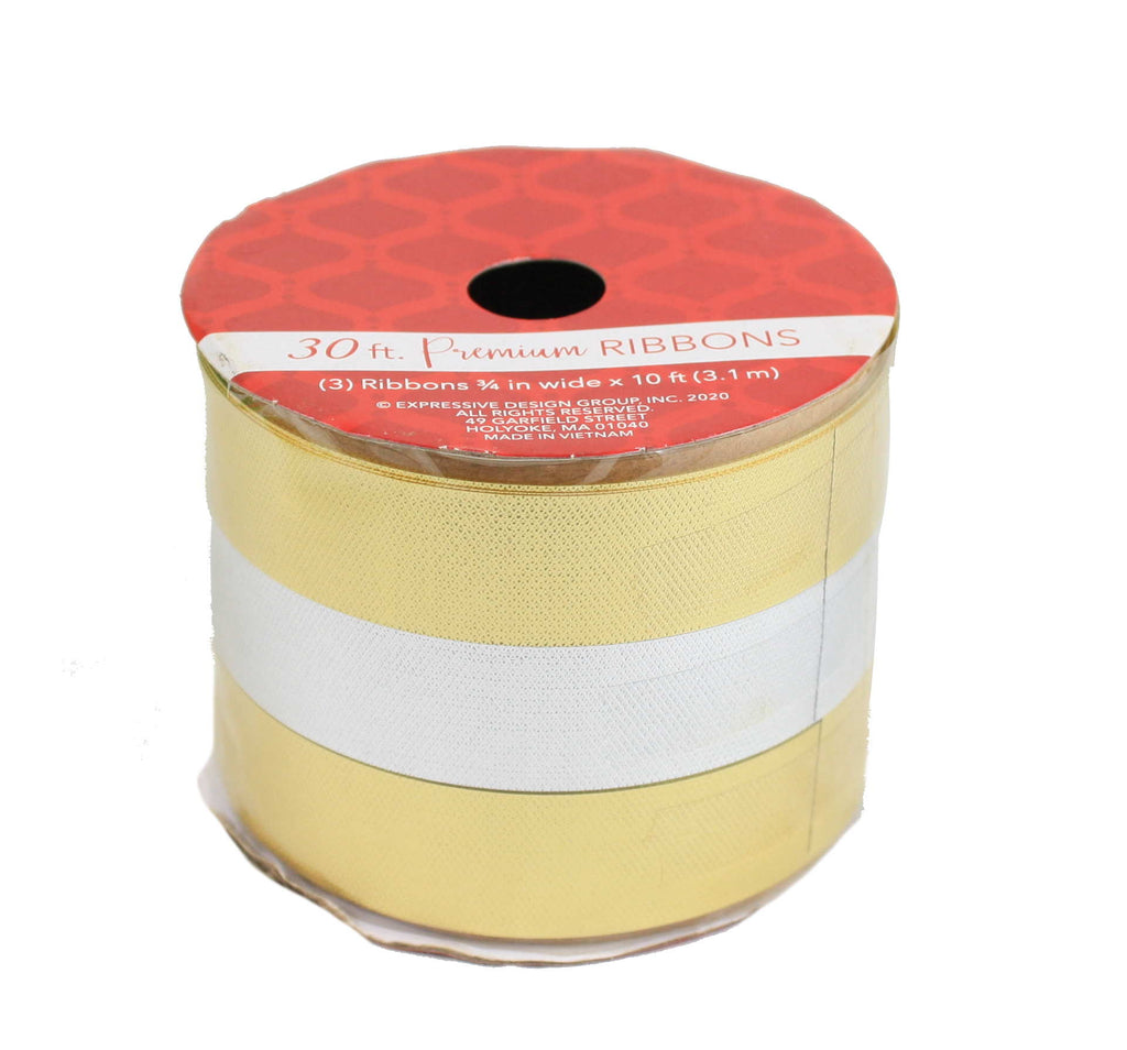 Single spool of premium wrapping ribbon in gold/silver/gold. Pefect to finish the great wrapping job you've done, or as the finishing touches on Gift Bag.