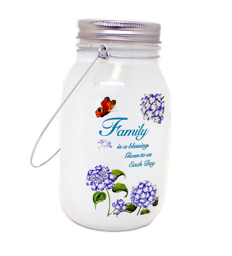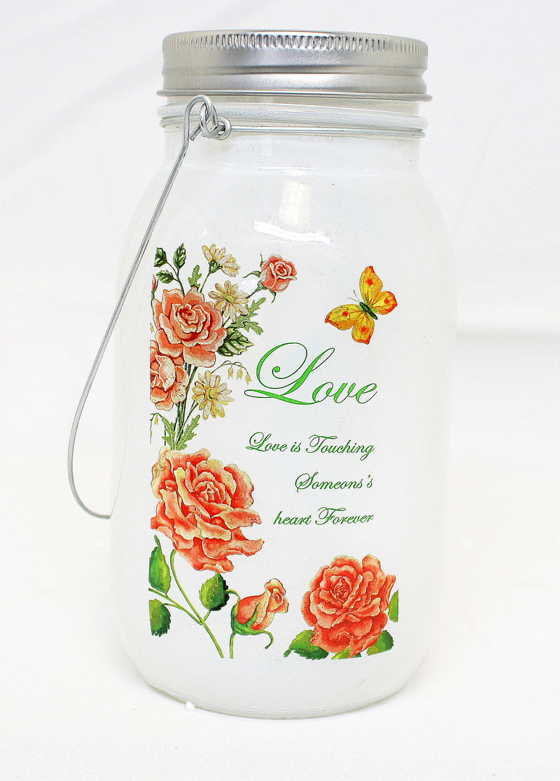 Opaque glass jar with a metal handle and lid. Inside are LED lights. Outside the jar is a variety of flowers and it reads in purple: "Dream for tomorrow live for today."