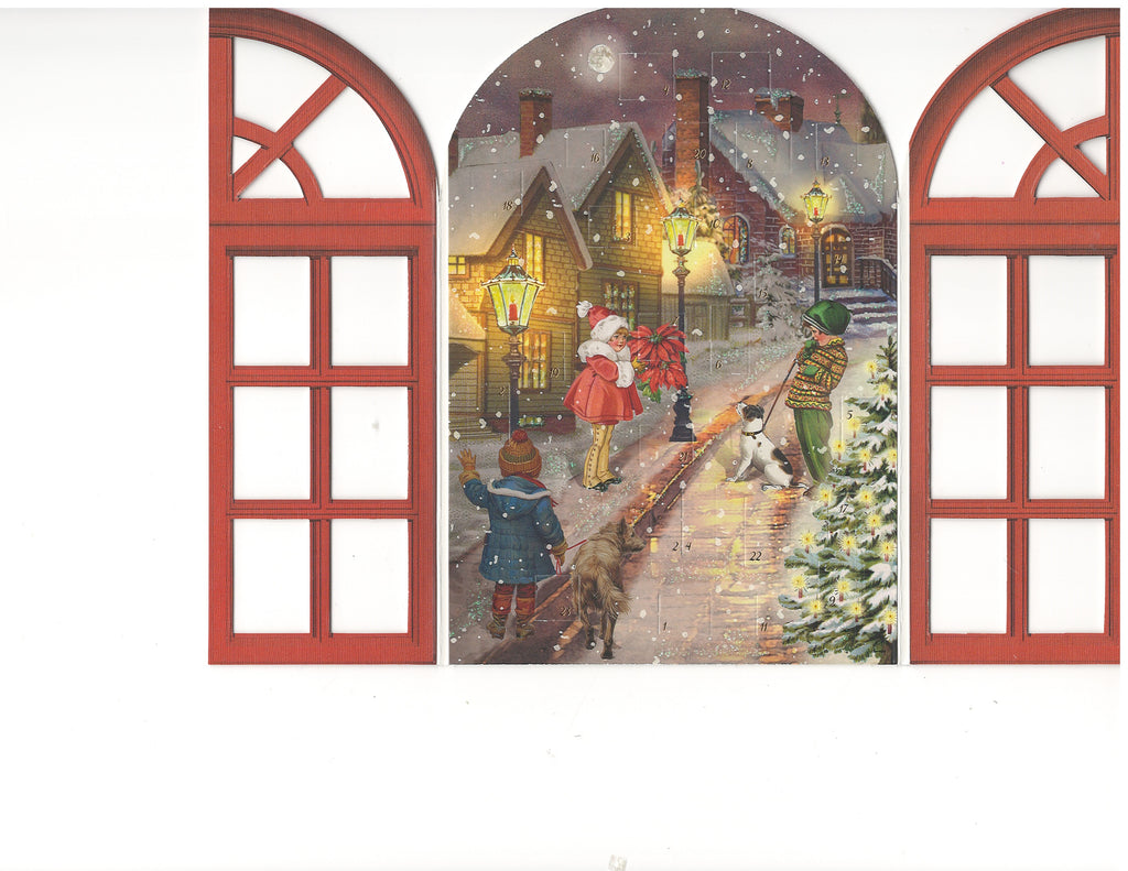 Embrace the wonder of the holiday season with this charming Advent Greeting Card, featuring a delightful winter door scene! Measuring 4.5 inches by 6.5 inches, this beautifully illustrated card captures the joy and excitement of Christmas as children revel in the festive atmosphere, complete with twinkling lights, snow-covered streets, and a playful dog. The inviting red door design opens to reveal 24 doors, each containing a captivating image that enhances the spirit of Advent.