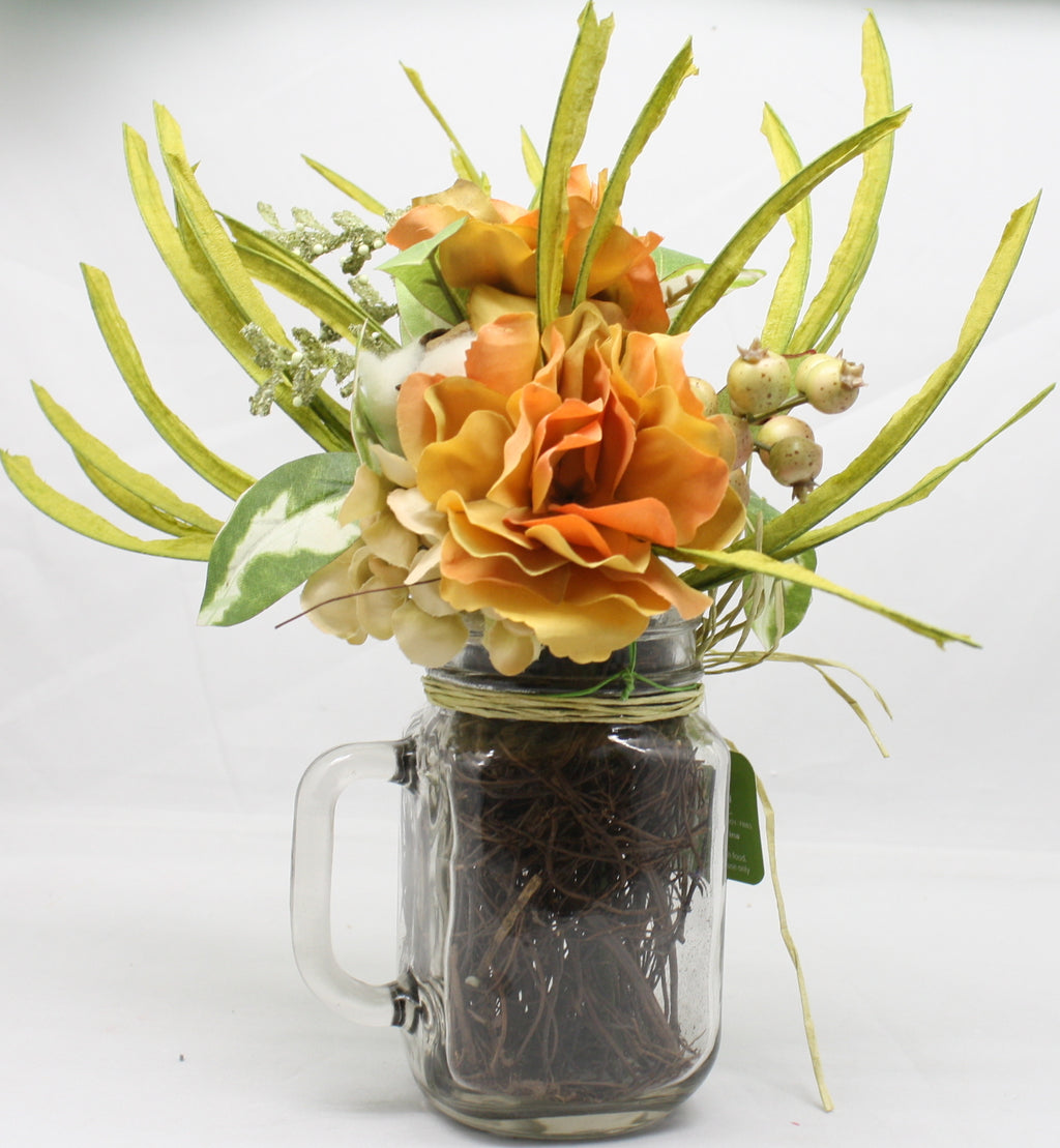 This beautiful floral arrangement is the perfect addition to any home! The natural looking group of peach flowers, greens, and berries in a mason jar measures 9 inches and is sure to bring a touch of nature into your living space.