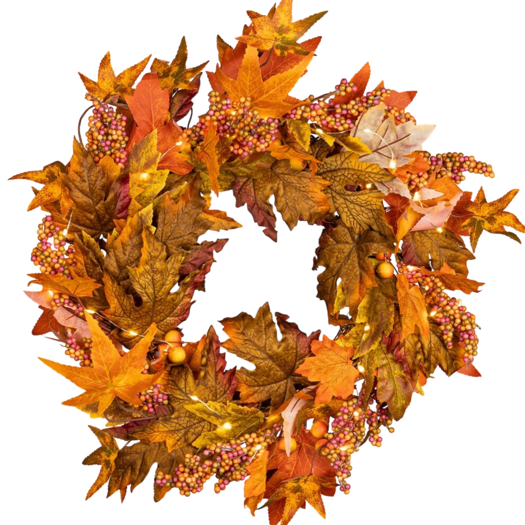 As leaves turn from green to their fiery autumn hues, many cultures have long celebrated the harvest with joyful gatherings and cherished traditions. This lighted wreath serves not just as decoration but as a symbol of gratitude and togetherness during this special time of year. Requiring three AA batteries (not included), it's designed for ease and convenience, allowing you to place it anywhere you desire without the fuss of cords. Hang it on your front door, over a mantel, or as a centerpiece, and let the spirit of fall, with its fragrant air and bountiful harvests, fill your home with joy and warmth!