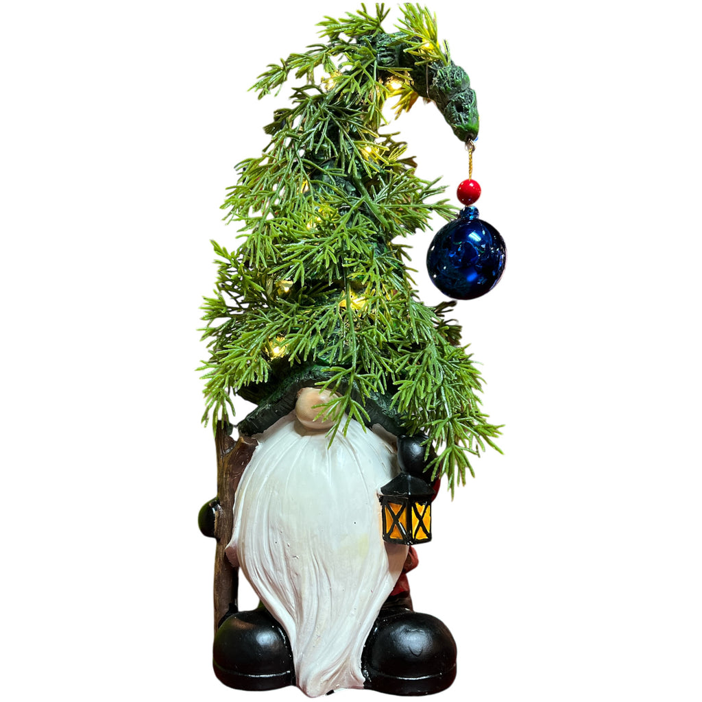 Add a whimsical touch to your holiday decor with this charming Lighted Resin Gnome Figurine. Standing at about a foot tall, this delightful gnome is ready to brighten up your festive season. Topped with a tree hat adorned with twinkling lights and a cheerful ornament, it brings a splash of joy and color to any room.
