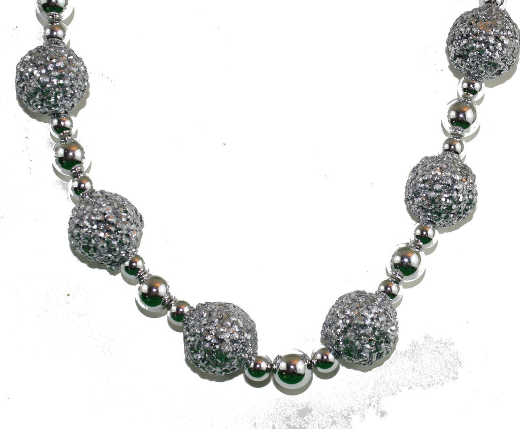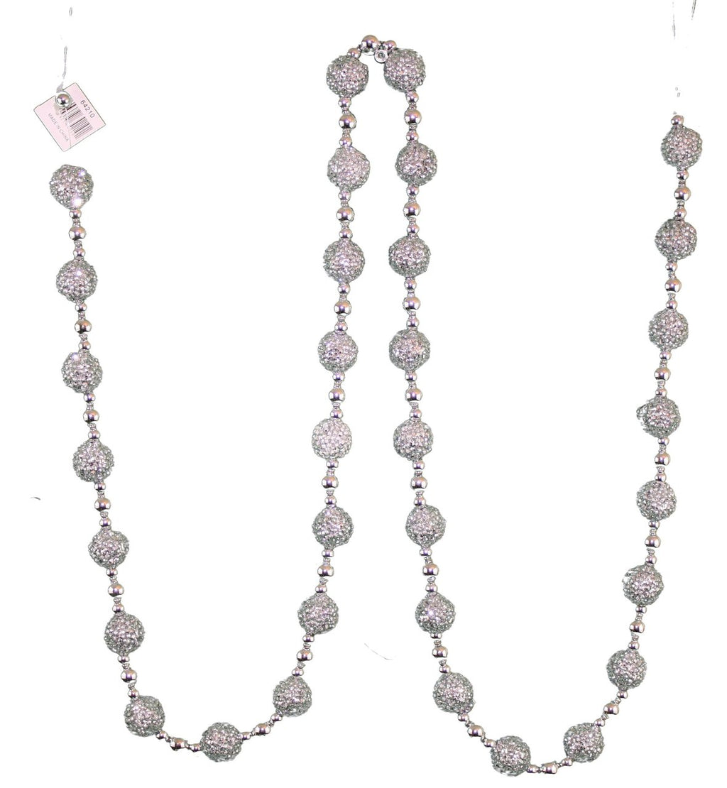6 Foot long Beaded Garland with a repeating Large, small,Medium,small pattern. Reflective silver plastic beads with a Large Glittered bead every 2 inches.